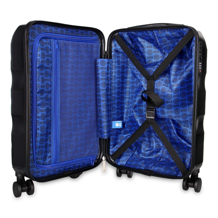 Il trolley INTER è la valigia ideale da utilizzare per i tuoi viaggi e weekend fuori casa. Il rivestimento rigido color nero protegge al meglio anche i prodotti più fragili e assicura resistenza e durata del trolley. Le 4 rotelle girevoli garantiscono una mobilità fluida in qualsiasi direzione, mentre la maniglia superiore per il sollevamento/trasporto e il carrello di traino estensibile integrato garantiscono comodità e maneggevolezza. La chiusura con cerniera lampo e il lucchetto integrato con codice a 3 cifre assicurano un alto grado di sicurezza. Il trolley è personalizzato con una targhetta con logo INTER silver su smalto nero che lo rende unico e inconfondibile.
