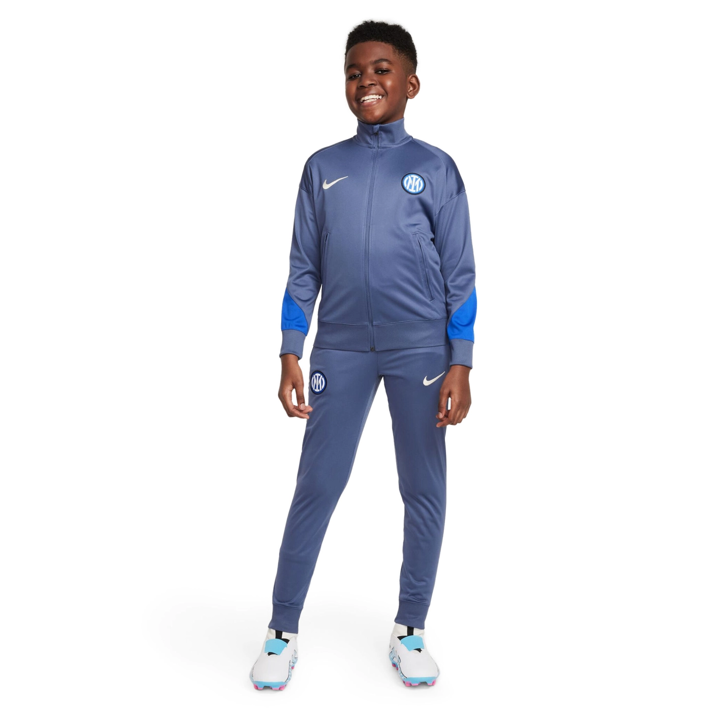 The INTER training tracksuit boasts design features specially tailored to football's rising stars. The casual, relaxed fit pairs well with breathable fabric that keeps you cool so you can hone your skills with maximum concentration. Nike Dri-FIT technology wicks sweat away from your skin for quicker evaporation, helping you to stay dry and comfortable. Zip pockets mean you can keep your essentials safe. Lower leg zips allow you to change quickly without taking off your shoes. Elasticated neck and cuffs.